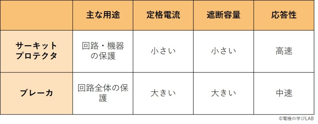 - サーキットプロテクタ=応答性重視(機器単位の高速保護)